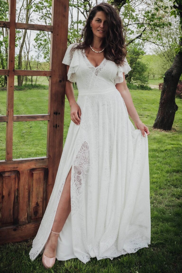 Uszyta ze sprawdzonych i przetestowanych przez nas materiałów. Używane przez nas koronki są mięciutkie, a dzięki swej lekkości cudownie układają się na sylwetce i pięknie wirują w tańcu. Ich elastyczność sprawia, że pracują z Twoim ciałem. Zapewniają komfort rosnącemu ciążowemu brzuszkowi. Praktycznie wszystkie nasze koronki są łatwe do prania w domowej pralce i niegniotące, dzięki czemu swoją suknię spokojnie możesz spakować do walizki i zabrać na romantyczną sesję poślubną.