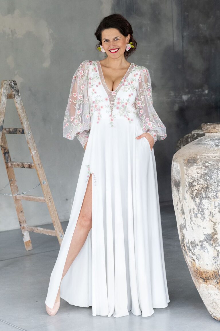 Ta suknia to model wyjściowy - możemy w niej zmienić praktycznie wszystko! Pogłębić lub spłycić dekolt, zmienić jego wykończenie, kształt, dodać lub odjąć falbankę czy frędzle. Rękawy mogą być dłuższe lub krótsze, mieć inny kształt niż te na zdjęciu. Może też nie być ich wcale. Tiul w spódnicy można dodać (lub odjąć) na wierzchu, albo pod spodem. Podszewka może być długa lub krótka w odcieniach bieli i beżu. Rozcięcie na nogę i tren można dodać lub usunąć praktycznie w każdym modelu.