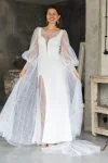 Ta suknia to model wyjściowy - możemy w niej zmienić praktycznie wszystko! Pogłębić lub spłycić dekolt, zmienić jego wykończenie, kształt, dodać lub odjąć falbankę czy frędzle. Rękawy mogą być dłuższe lub krótsze, mieć inny kształt niż te na zdjęciu. Może też nie być ich wcale. Tiul w spódnicy można dodać (lub odjąć) na wierzchu, albo pod spodem. Podszewka może być długa lub krótka w odcieniach bieli i beżu. Rozcięcie na nogę i tren można dodać lub usunąć praktycznie w każdym modelu.