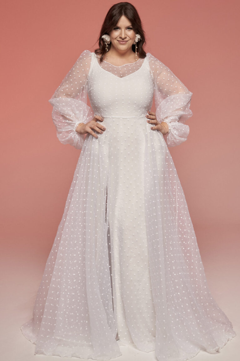 Jeżeli szukasz ślubnej kreacji, obok której nikt nie przejdzie obojętnie to sprawdź czy nie znalazłaś! Ta biała suknia ślubna w kropki to połączenie dziewczęcego uroku i seksapilu! Nie wyobrażasz sobie wystąpić w tym dniu w kolorze innym niż biały, ale to jedyny pożądany przez Ciebie element klasyki i chciałabyś znaleźć suknię piękną, a jednocześnie oryginalną? Ta kreacja przepięknie będzie prezentować się podczas ślubów w zimowe miesiące. Tylko wyobraź sobie ten wzór w połączeniu z płatkami śniegu w tle na ślubnej pamiątce! Wierzchnia warstwa z organzy jest mocno zabudowana, jednak dzięki mocniej wyciętej podszewce w dekolcie, zarówno z przodu jak i z tyłu oraz braku podszewki w rękawach, całość nie wygląda ciężko. Dekolt z tyłu eksponuje plecy oraz umożliwia założenia klasycznego biustonosza, co zapewni komfort podczas uroczystości. Charakterystycznym i przyciągającym wzrok elementem tej białej sukni ślubnej plus size kropki są bez wątpienia duże, luźne, bufiaste rękawy, które nadają iście bajkowego charakteru całej stylizacji. Niezwykle eleganckim akcentem jest tren – pamiętaj jednak, że nie będzie on najlepszym wyborem, jeżeli zamierzasz tańczyć do białego rana, ale spokojnie – pamiętaj, że w naszych sukniach możemy wszystko zmienić, więc możesz z niego zrezygnować. Dzięki spódnicy uszytej z całego koła, kreacja będzie prezentować się bajecznie podczas tańca! Seksowny rozporek w podszewce sprawia, że suknia nabiera lekkości i delikatności, a dodatkowo cała sylwetka wygląda smuklej.