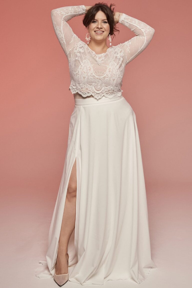 Uszyta ze sprawdzonych i przetestowanych przez nas materiałów. Używane przez nas koronki są mięciutkie, a dzięki swej lekkości cudownie układają się na sylwetce i pięknie wirują w tańcu. Ich elastyczność sprawia, że pracują z Twoim ciałem. Zapewniają komfort rosnącemu ciążowemu brzuszkowi. Praktycznie wszystkie nasze koronki są łatwe do prania w domowej pralce i niegniotące, dzięki czemu swoją suknię spokojnie możesz spakować do walizki i zabrać na romantyczną sesję poślubną.