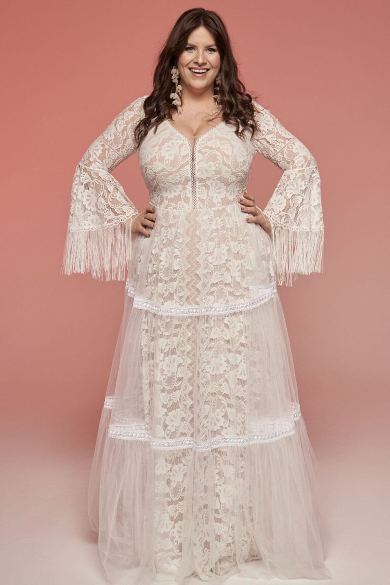 Ta suknia to model wyjściowy - możemy w niej zmienić praktycznie wszystko! Pogłębić lub spłycić dekolt, zmienić jego wykończenie, kształt, dodać lub odjąć falbankę czy frędzle. Rękawy mogą być dłuższe lub krótsze, mieć inny kształt niż te na zdjęciu. Może też nie być ich wcale. Tiul w spódnicy można dodać (lub odjąć) na wierzchu, albo pod spodem. Podszewka może być długa lub krótka w odcieniach bieli i beżu. Rozcięcie na nogę i tren można dodać lub usunąć praktycznie w każdym modelu.