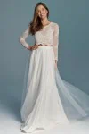 Ta suknia to model wyjściowy - możemy w niej zmienić praktycznie wszystko! Pogłębić lub spłycić dekolt, zmienić jego wykończenie, kształt, dodać lub odjąć falbankę czy frędzle. Rękawy mogą być dłuższe lub krótsze, mieć inny kształt niż te na zdjęciu. Może też nie być ich wcale. Tiul w spódnicy można dodać (lub odjąć) na wierzchu, albo pod spodem. Podszewka może być długa lub krótka w odcieniach bieli i beżu. Rozcięcie na nogę i tren można dodać lub usunąć praktycznie w każdym modelu.