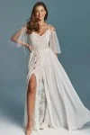 Ta suknia to model wyjściowy - możemy w niej zmienić praktycznie wszystko! Pogłębić lub spłycić dekolt, zmienić jego wykończenie, kształt, dodać lub odjąć falbankę czy frędzle. Rękawy mogą być dłuższe lub krótsze, mieć inny kształt niż te na zdjęciu. Może też nie być ich wcale. Tiul w spódnicy można dodać (lub odjąć) na wierzchu, albo pod spodem. Podszewka może być długa lub krótka w odcieniach bieli i beżu. Rozcięcie na nogę i tren można dodać lub usunąć praktycznie w każdym modelu.
