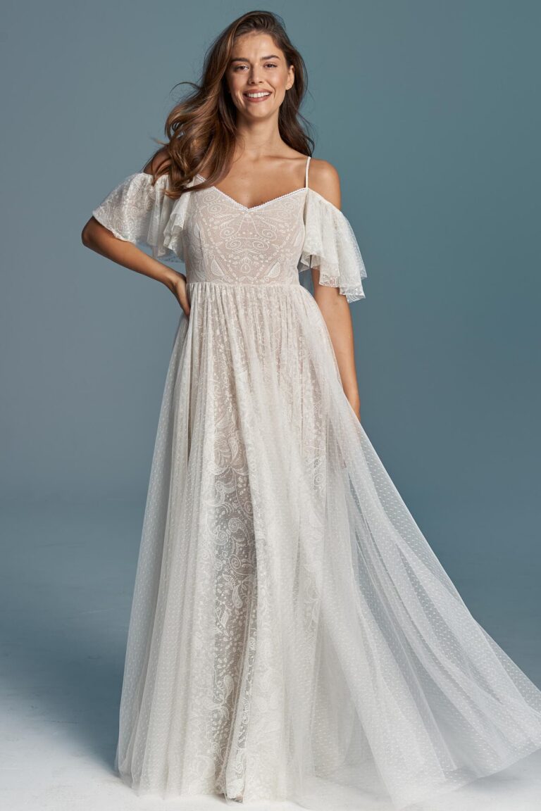 Ta suknia to model wyjściowy - możemy w niej zmienić praktycznie wszystko! Pogłębić lub spłycić dekolt, zmienić jego wykończenie, kształt, dodać lub odjąć falbankę czy frędzle. Rękawy mogą być dłuższe lub krótsze, mieć inny kształt niż te na zdjęciu. Może też nie być ich wcale. Tiul w spódnicy można dodać (lub odjąć) na wierzchu, albo pod spodem. Podszewka może być długa lub krótka w odcieniach bieli i beżu. Rozcięcie na nogę i tren można dodać lub usunąć praktycznie w każdym modelu.