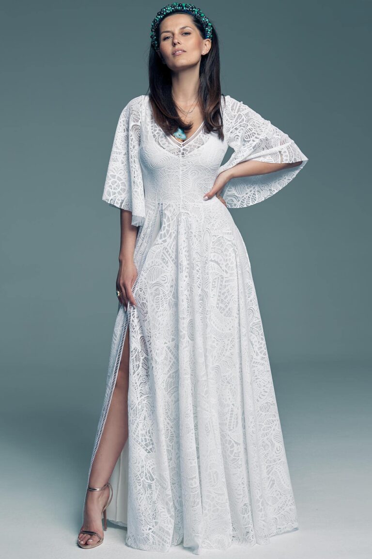 Ta suknia to model wyjściowy - możemy w niej zmienić praktycznie wszystko! Pogłębić lub spłycić dekolt, zmienić jego wykończenie, kształt, dodać lub odjąć falbankę czy frędzle. Rękawy mogą być dłuższe lub krótsze, mieć inny kształt niż te na zdjęciu. Może też nie być ich wcale. Tiul w spódnicy można dodać (lub odjąć) na wierzchu, albo pod spodem. Podszewka może być długa lub krótka w odcieniach bieli i beżu. Rozcięcie na nogę i tren można dodać lub usunąć praktycznie w każdym modelu.