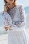 Uszyta ze sprawdzonych i przetestowanych przez nas materiałów. Używane przez nas koronki są mięciutkie, a dzięki swej lekkości cudownie układają się na sylwetce i pięknie wirują w tańcu. Ich elastyczność sprawia, że pracują z Twoim ciałem. Zapewniają komfort rosnącemu ciążowemu brzuszkowi. Praktycznie wszystkie nasze koronki są łatwe do prania w domowej pralce i niegniotące, dzięki czemu swoją suknię spokojnie możesz spakować do walizki i zabrać na romantyczną sesję poślubną.
