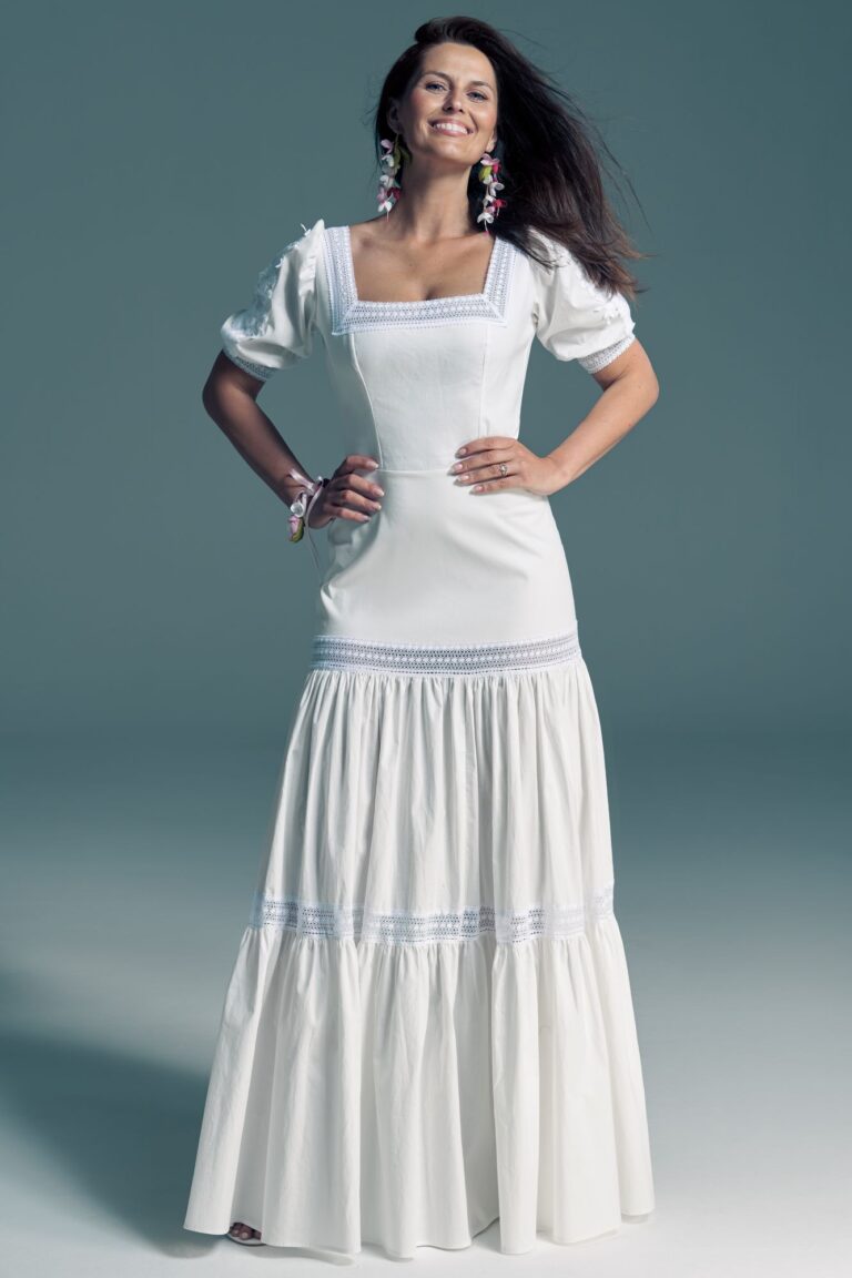 Twoją suknię uszyjemy ze sprawdzonych i przetestowanych przez nas materiałów. W tej sukni dominuje lekka i oddychająca bawełna, jedynie wstawki są z elastycznej koronki. Tkanina ta wprawdzie nie jest tak elastyczna jak nasze koronki i wymaga prasowania, ale jest naturalna i wyjątkowo przyjazna twojej skórze. A jeśli zdecydujesz, by po ślubie przerobić swoją suknię tak, byś mogła ją nosić na co dzień, to z łatwością ją zafarbujesz w profesjonalnej farbiarni.