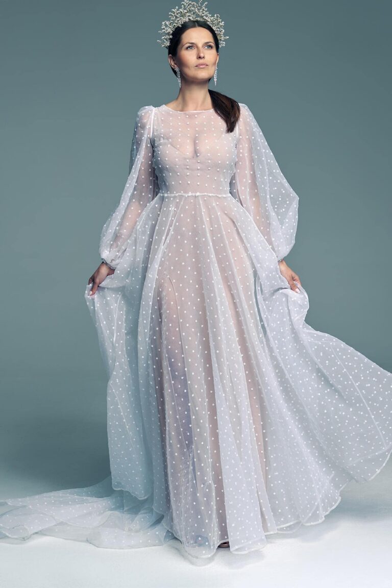 Lubisz ciekawe rozwiązania, które nie tylko zachwycą, ale i zaskoczą wszystkich gości na weselu? A może po prostu ponad wszystko lubisz wyglądać nie tylko wyjątkowo, ale też charakternie i oryginalnie? To kreacja, która może na dłużej zatrzymać Twój wzrok. Dopasowana podszewka w kolorze cielistym na cienkich ramiączkach oraz z mocno wyciętym dekoltem wygląda praktycznie jak druga skóra! Dzięki temu wierzchnia warstwa sukni wykonana z organzy wygląda jakby była założona na nagie ciało! Mimo, że jest to suknia ślubna z zabudowanym dekoltem to dzięki przezroczystościom wcale nie wygląda ciężko. Długi tren dodaje elegancji i doniosłości kreacji, a groszki sprawiają, że całość wygląda dziewczęco i romantycznie. Elementem mocno przyciągającym wzrok są z pewnością duże, luźne, szerokie, bufiaste rękawy, które dodają wyjątkowości całej stylizacji. Nie do końca możesz czuć się w niej dobrze, jeśli jesteś posiadaczką figury tzw. odwróconego trójkąta, czyli dużego biustu oraz szerokich ramion i ich nie lubisz. Jeżeli dążysz do wyrównania proporcji sylwetki to ten wybór nie będzie trafny, ponieważ rękawki mogą dodatkowo poszerzyć sylwetkę i sprawić, że góra będzie wyglądała na jeszcze bardziej masywną. Całość z pewnością wygląda niesztampowo i wyjątkowo, więc jeśli szukasz sukni, która sprawi, że goście na weselu oniemieją z wrażenia to ta kreacja będzie bez wątpienia dobrym wyborem.