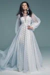 Dwuwarstwowa suknia ślubna z koronki i organtyny w groszki to niepowtarzalne połączenie dla odważnych Panien Młodych. Spodnią warstwę stanowi dopasowana sukienka z elastycznej koronki, z głębokim dekoltem z przodu. Natomiast wierzchnia warstwa to zabudowany top, bufiaste rękawy i spódnica z koła ze sztywnej organtyny. Pamiętaj, że szyjąc ten model dla Ciebie na miarę możemy zmieniać dowolnie wszystko w obu warstwach! W koronce możemy zmniejszyć dekolt, zrobić luźniejszy dół, dodać rozcięcie na nogę, frędzle czy zmienić kolor podszewki. Natomiast w wierzchniej warstwie możemy zmienić kształt i długość rękawa, dekoltu oraz spódnicy.