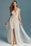 Ta suknia to model wyjściowy - możemy w niej zmienić praktycznie wszystko! Pogłębić lub spłycić dekolt, zmienić jego wykończenie, kształt, dodać lub odjąć falbankę czy frędzle. Rękawy mogą być dłuższe lub krótsze, mieć inny kształt niż te na zdjęciu. Może też nie być ich wcale. Tiul w spódnicy można dodać (lub odjąć) na wierzchu, albo pod spodem. Podszewka może być długa lub krótka w odcieniach bieli i beżu. Rozcięcie na nogę i tren można dodać lub usunąć praktycznie w każdym modelu.